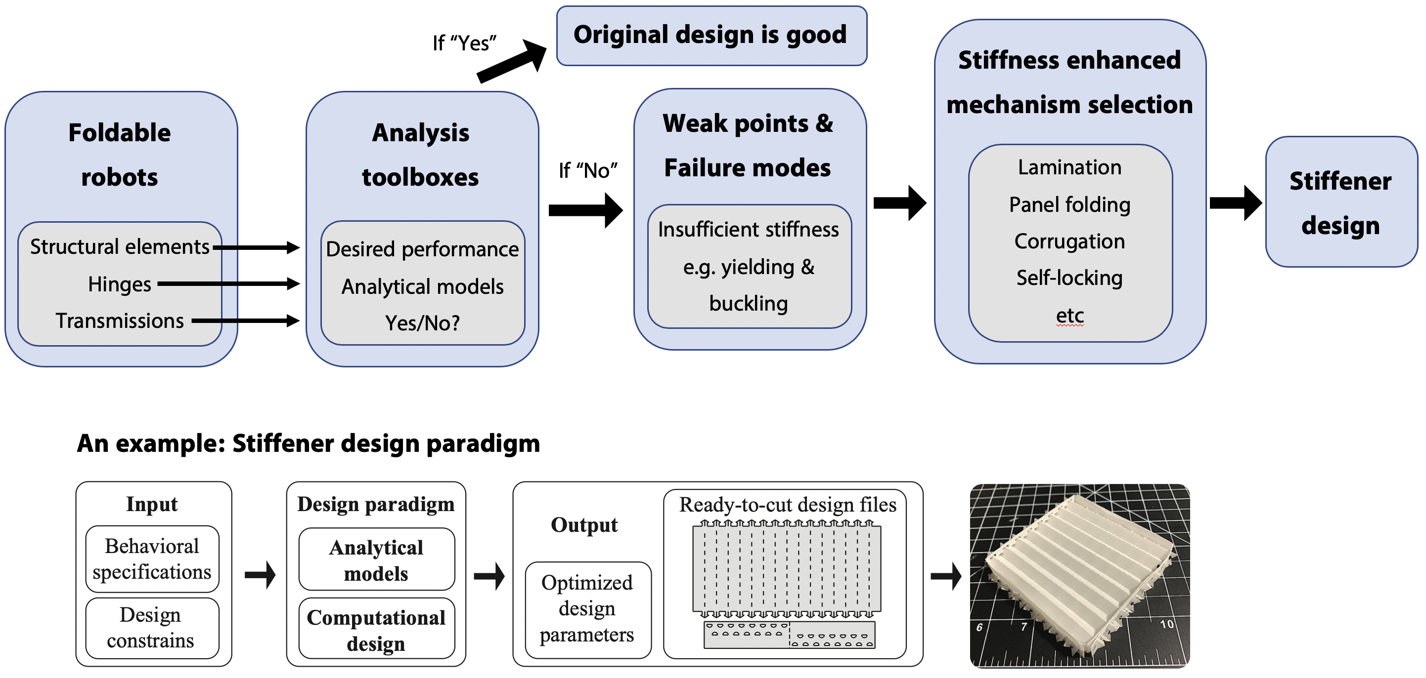 For the next two months, I will be focusing on designing structural elements, which is a major component in foldable robotic systems. I will build analysis design toolbox that will determine whether current design is sufficient to meet desired performance. If so, we will keep the current design. If not, the toolbox will tell us the weak points and failure modes so that we can design stiffeners (stiffness enhance mechanisms) correspondingly. The stiffener design process will follow the same design paradigm as what we have done for the currugated mechanism. The project goal for ICRA 2021 is shown below.