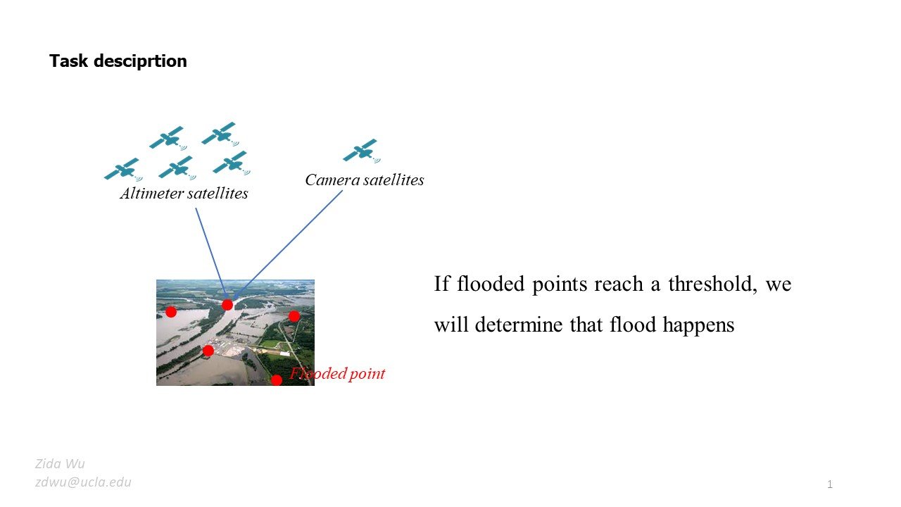 Summary:\ In this project, there is a netowrk of SWOT satellites with 5 altimeters satellites and 1 camera satellite running on different orbits. Each of them has different sensor to detect the ground points of the river. The goal is to decide whether the flood happens or not.