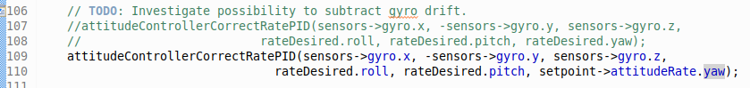 Fixing Alternation Issue: To fix this, a more direct approach can be implemented for controlling yaw rate, which is to directly feed the user input into the yaw rate controller (circumventing the yaw position controller). This will avoid the angle rollover issue. To do this, I modified the 'controller_pid.c' file as shown in the picture below (the commented code is the original function call).