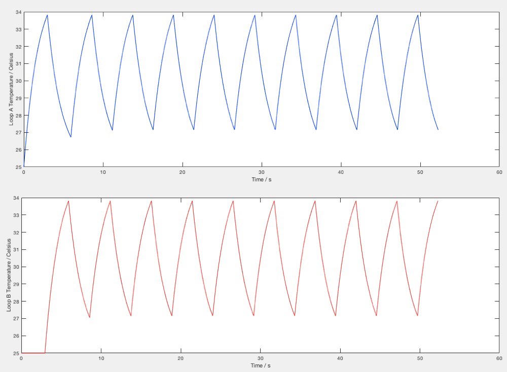Last quarter I finished building the model of the oscillation period of the mechanical logic in one single snap-through motion. This week I studied the periodic motion of the system and found that as the oscillation becomes stable, the oscillation period tends to decrease over time before converging to a limit, which is the real oscillation period in the long run. This is due to the fact that the temperature of the actuators cannot decrease to room temperature once it has heated up. Attached is a plot of the temperature of the two actuators in the long run. The picture should be self-explanatory--the temperature of the actuators stays at a temperature slightly higher than the room temperature in the long run.