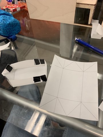 Our goal last week was to convert the boat chassis from an origami structure to a 2D template that was designable on RoCo. The template still needs to be made of one uncut sheet, like origami, so that water can't leak in through edges, but it can be folded from shapes other than a square. The first template was folded from one flat sheet of plastic to create a simple pointed box. However, this was not a floatable boat so we modified the folds for the next iteration.
